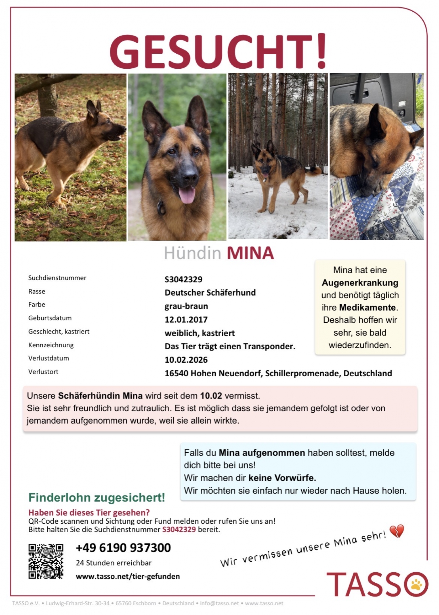 wir vermissen leider seit dem 10.02.26 unsere Schäferhündin Mina. Sie ist in 16540 Hohen Neuendorf (bei Berlin) im Wald entlaufen und seitdem spurlos verschwunden. Wir haben in den Wochen nach ihrem Verschwinden alles Mögliche versucht um sie zu finden, aber sie ist wie vom Erdboden verschluckt. Suchhunde haben angezeigt, dass ihre Spur durch den Wald geht und dann an einer wenig befahrenen Straße dort endet. Wir vermuten, dass sie vielleicht mitgenommen wurde, weshalb wir jetzt versuchen großräumig darauf aufmerksam zu machen. Sie ist gechippt und registriert bei Tasso, Findefix und dem polnischen Safe Animal. Sie ist freundlich und dem Menschen zugewandt. Früher war sie Blindenführhündin, musste aber aufgrund einer Augenkrankheit in Frührente gehen. Ohne medikamentöse Behandlung könnte sie erblinden. Sie ist 9 Jahre alt und kastriert.