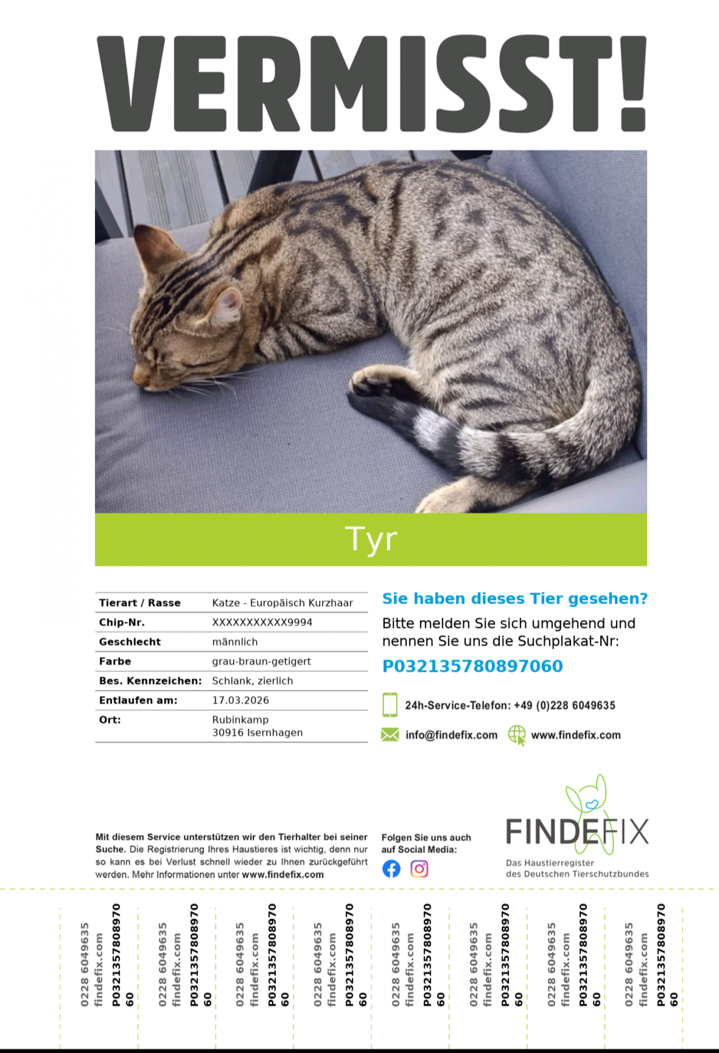 Bei Informationen über dessen Verbleib, bitte im Tierheim unter der 05136 3545 oder direkt beim Besitzer Bartels unter der Rufnummer melden.
