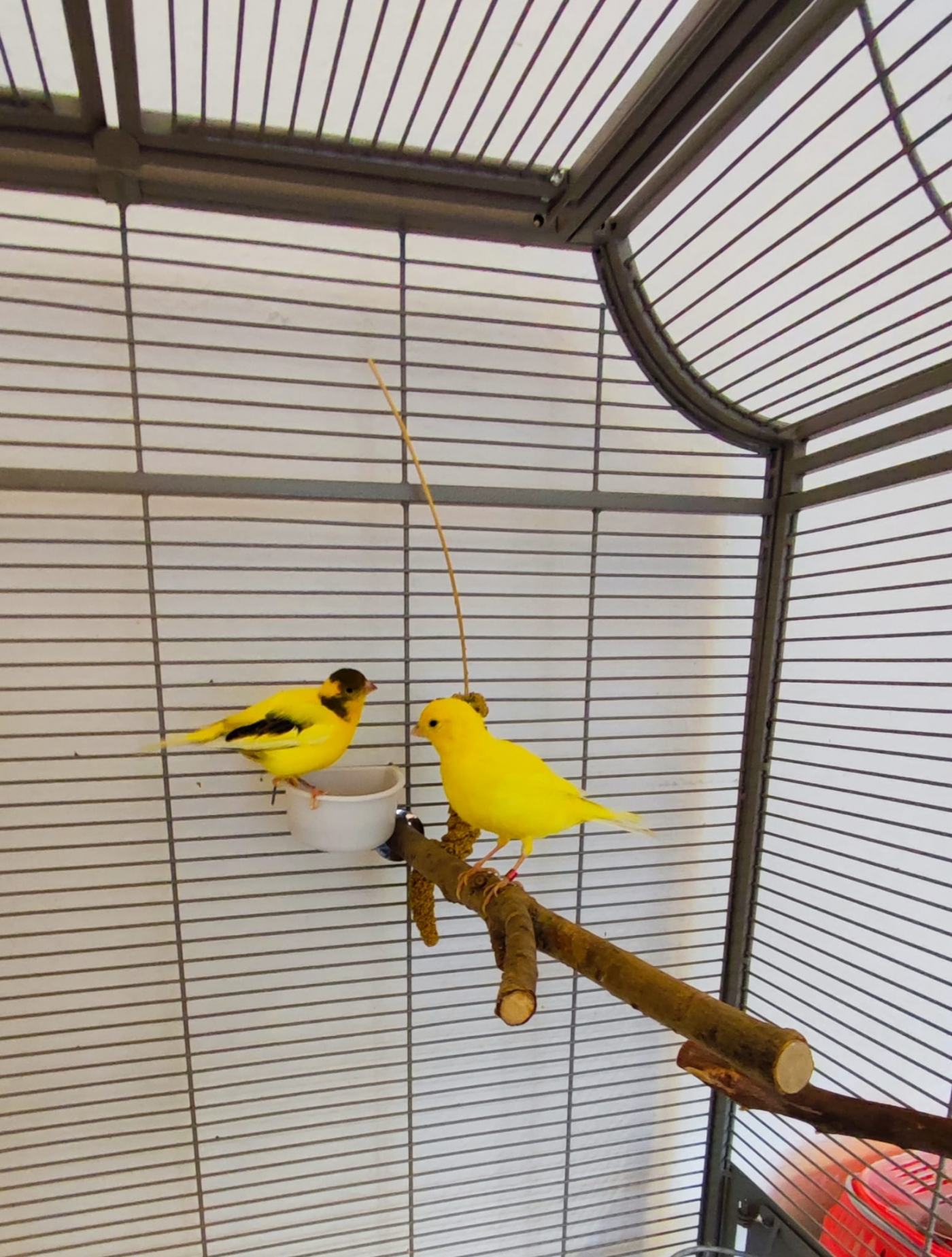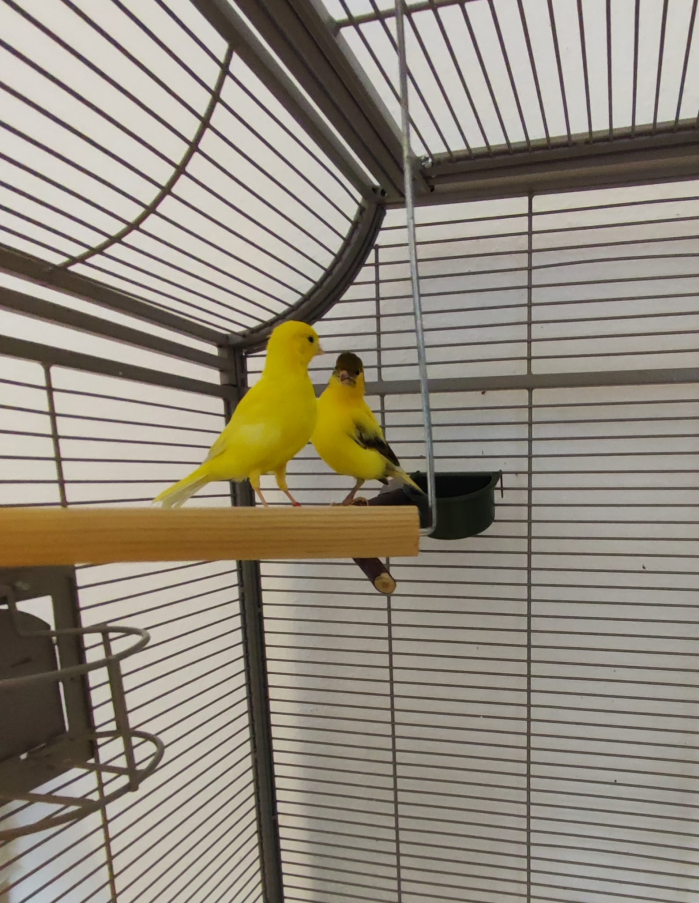 Hanni (gelb) und Pitri (gelb-braun) sind zwei Kanarienvögel, die sich bei uns im Tierheim zufällig kennengelernt und gut miteinander angefreundet haben.