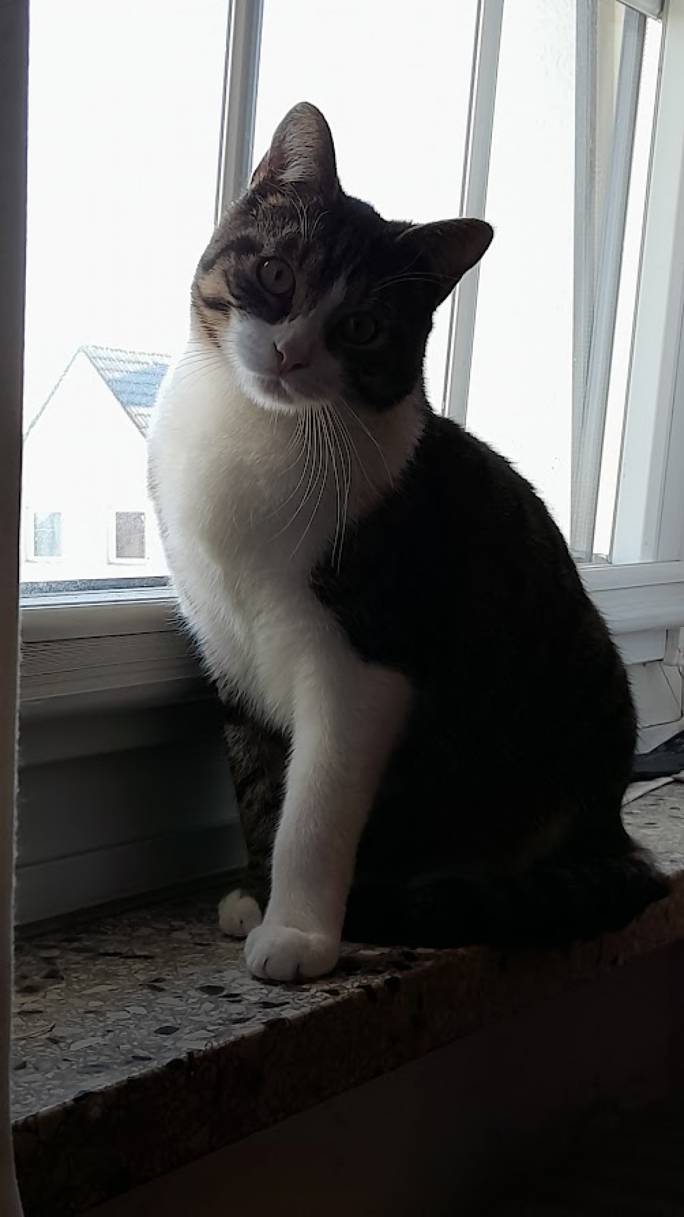 Er ist grau getigert, hat einen weißen Latz und sein linkes Vorderbein ist auch weiß. Seine Pfotenspitzen sind weiß und er hat einen weißen Fleck am linken Oberschenkel. Da er kein Freigänger ist, kennt er sich draußen nicht aus. Er ist scheu, hört aber auf seinen Namen.