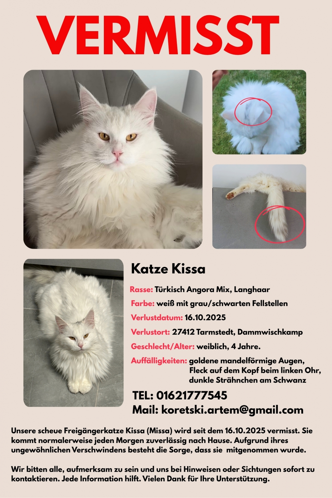 wir wenden uns mit einer großen Bitte an Sie: Unsere Katze Kisa (auch Misa genannt) wird seit Donnerstag, dem 16.10.2025, in 27412 Tarmstedt (Dammwischkamp) vermisst.