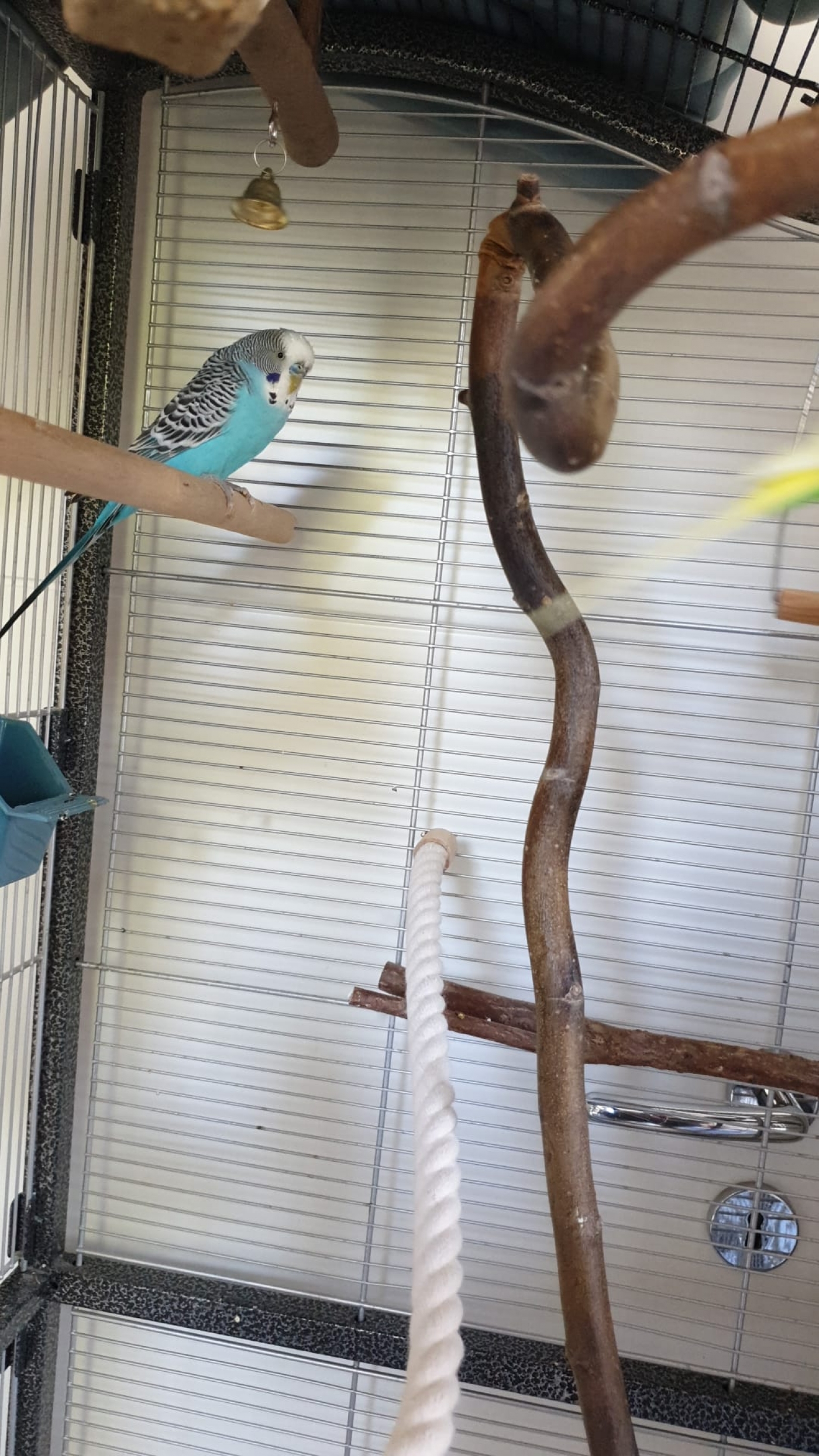 Blauer, vermutlich schon etwas älterer Wellensittich. Das Tier ist nicht handzahm, scheu und sehr still. Ist bei uns trotz offenem Käfig und Begleitwellensittich noch nicht geflogen, klettert und schaukelt jedoch. Der Welli ist seit 14.09.25 bei uns und war vorher eine Woche bei der Familie der Finderin. Das Tier scheint keine Verletzungen zu haben. Dort ist er geflogen, hatte jedoch auch keinen Käfig als Rückzugsort. Nimmt noch kein Grünfutter an.