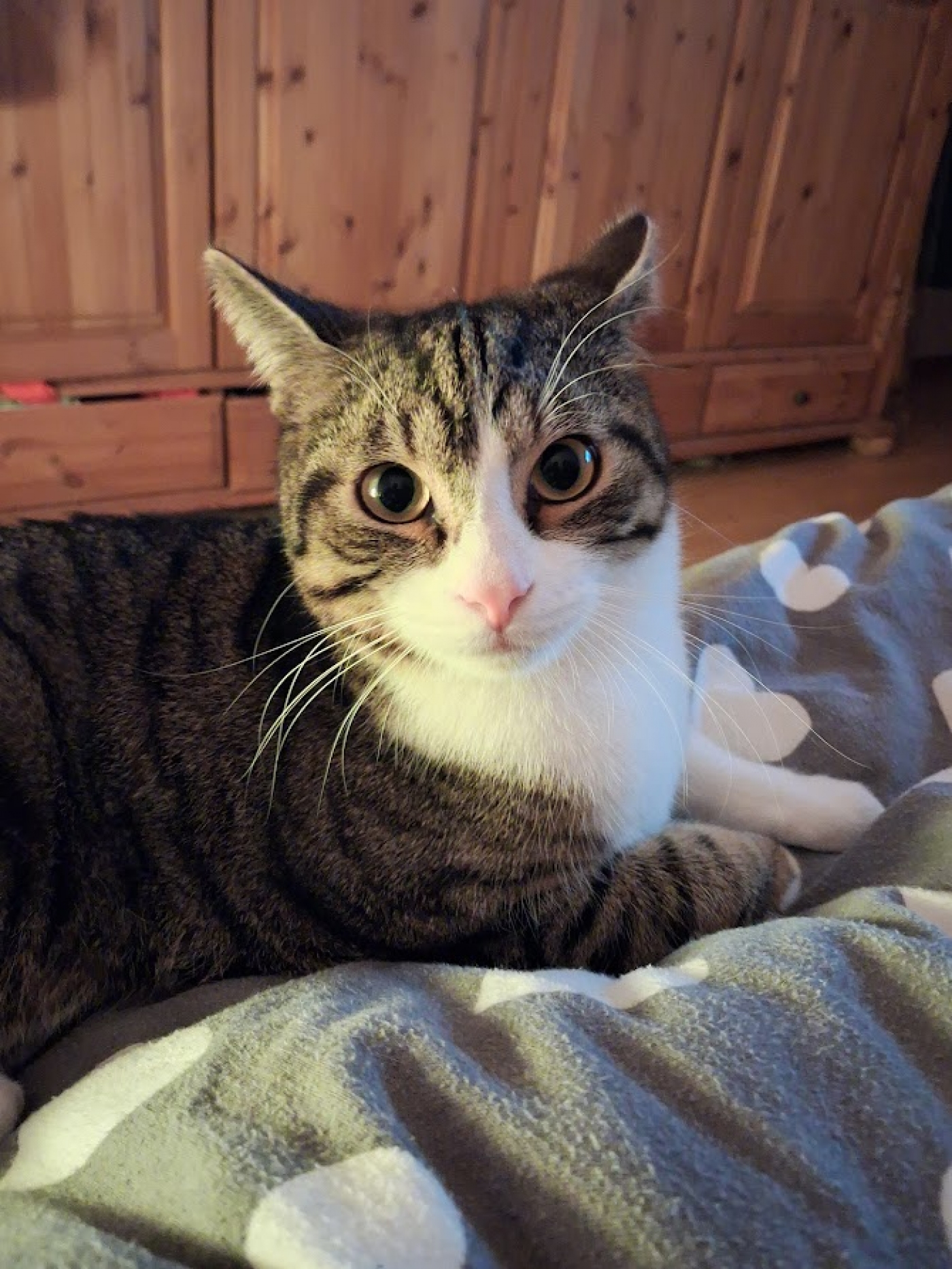 Er ist grau getigert, hat einen weißen Latz und sein linkes Vorderbein ist auch weiß. Seine Pfotenspitzen sind weiß und er hat einen weißen Fleck am linken Oberschenkel. Da er kein Freigänger ist, kennt er sich draußen nicht aus. Er ist scheu, hört aber auf seinen Namen.