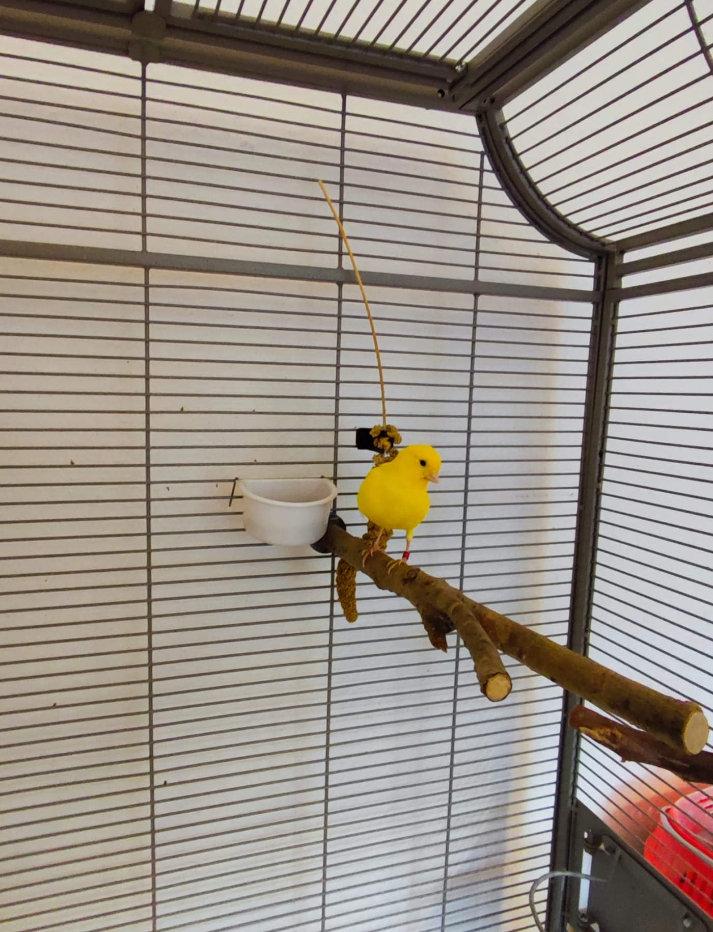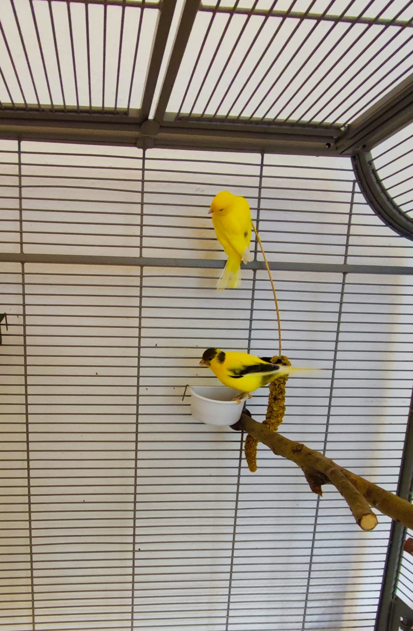 Hanni (gelb) und Pitri (gelb-braun) sind zwei Kanarienvögel, die sich bei uns im Tierheim zufällig kennengelernt und gut miteinander angefreundet haben.