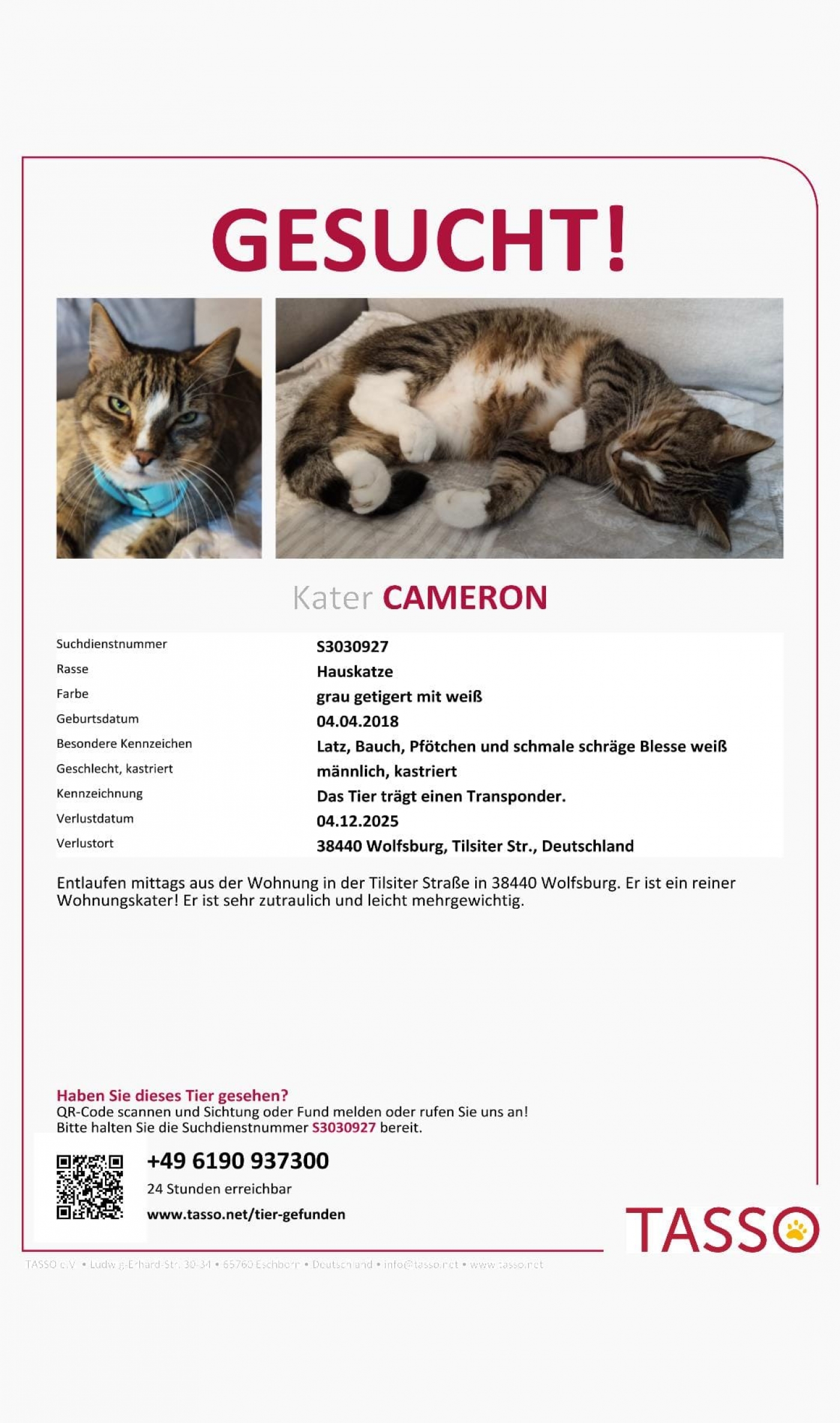 Seit dem 04.12.25 wird meine reine Wohungskatze aus der Tilsiter Str 3. Am Wohltberg Vermisst. Es fand ein Einbruch statt der möglicherweise mit dem verschwinden meines Katers Cameron im Zusammenhang steht. Er ist extrem zutraulich und lieb. Aber war in 7 Jahren noch nie draußen und ist vermutlich extrem ängstlich draußen. Bitte melden Sie sich wenn jemand Ihn gefunden hat.