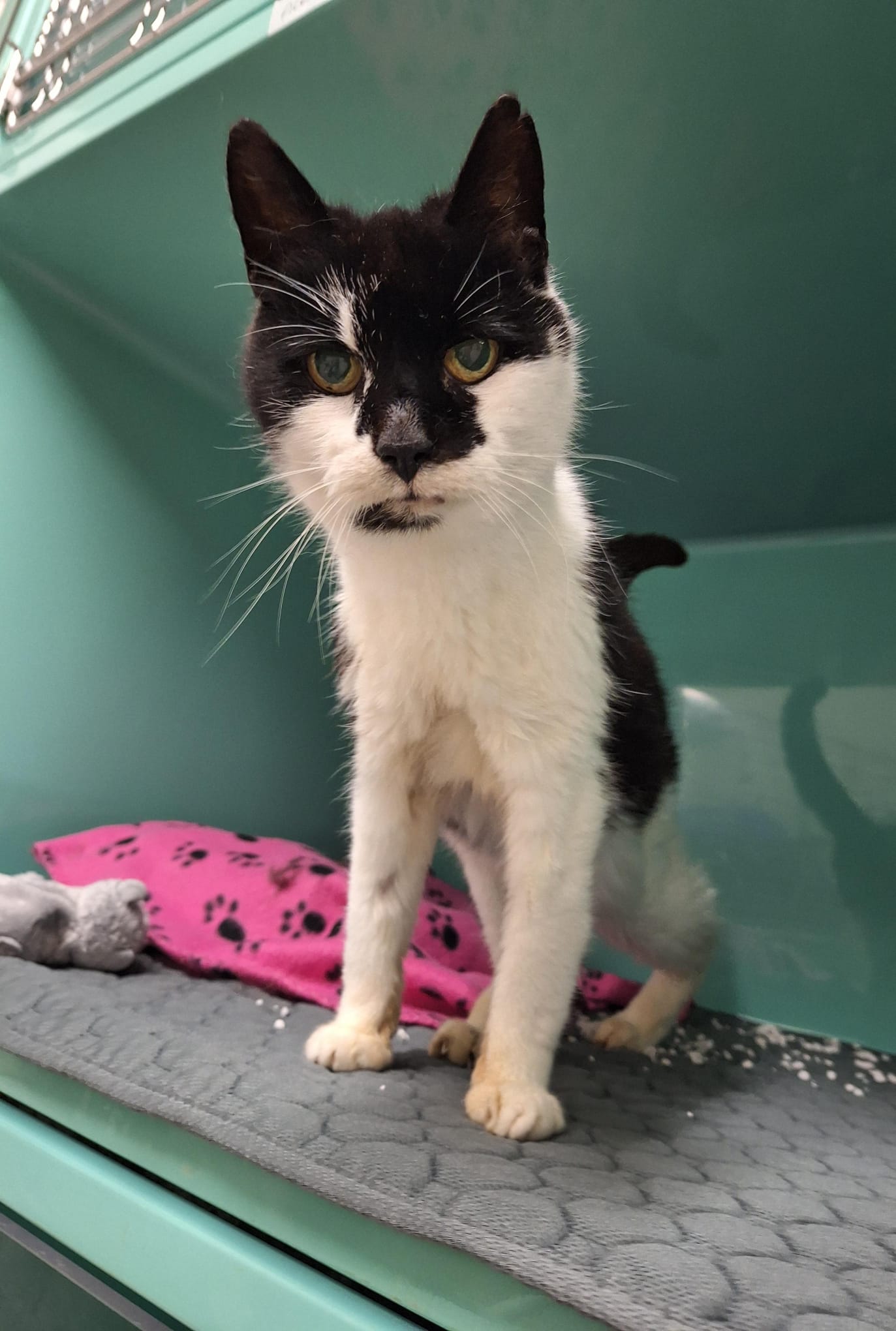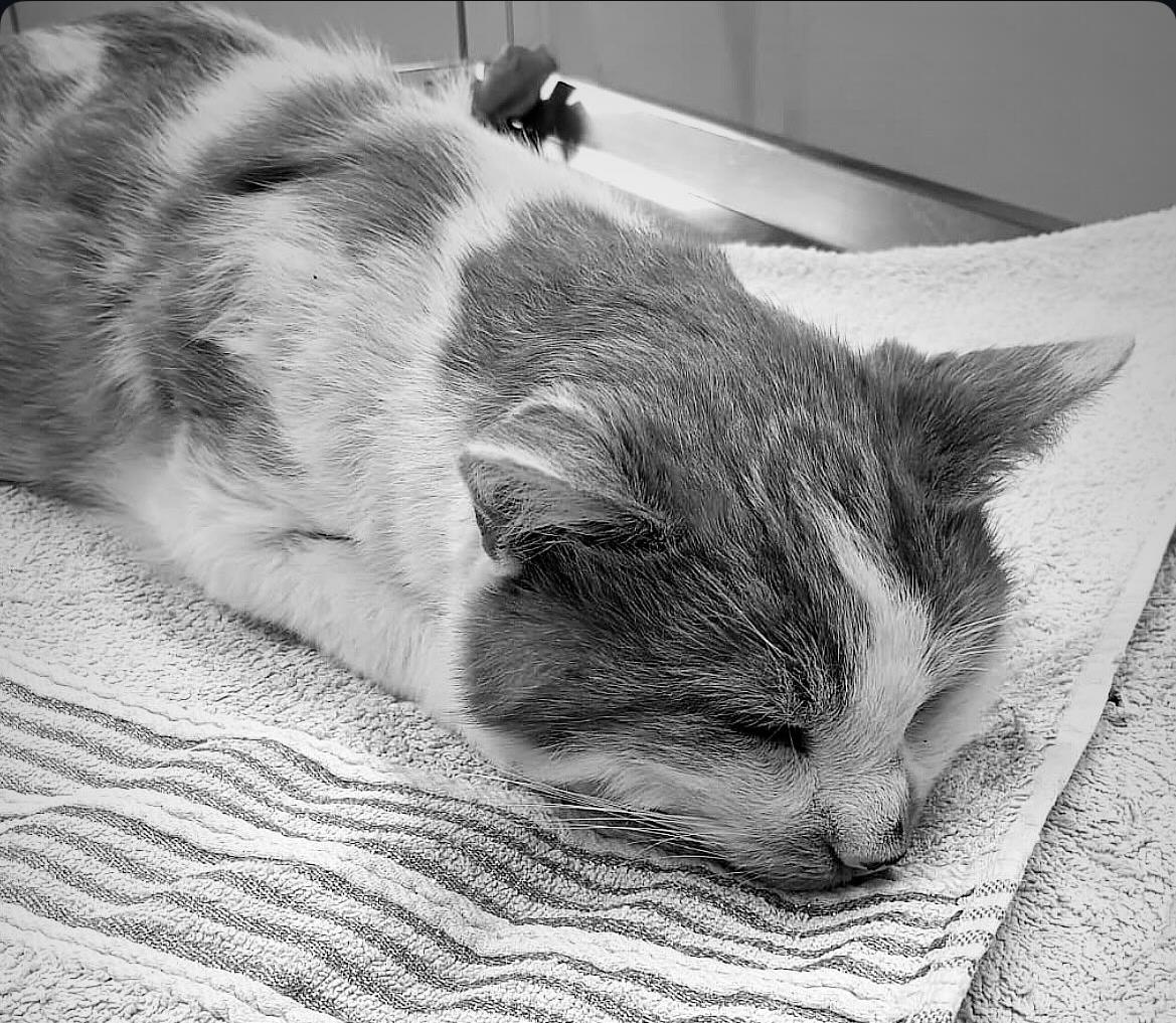 Sweetie war eine verwilderte Katze, die wir 2019 wieder ausgewildert hatten, weil sie mit uns Menschen nichts zu tun haben möchte. Leider haben wir sie durch eine unschöne Begegnung wiedergetroffen. Nach einer Fundmeldung über eine apathische Katze haben wir schließlich Sweetie gefunden - versteckt hinter einem Carport, apathisch, total schwach und bereits unterkühlt. Sie wollte noch fliehen, konnte aber nur kriechen - ihr linkes Hinterbein war ohne Gefühl. Wir konnten sie schnell sichern und sind sofort in unsere Vertragsklinik gefahren. Dort bestätigte sich recht schnell unser Verdacht, dass sie angefahren wurde. Abgesplitterte Vorderkrallen, rausgeschlagene Zähne, aufgeschürfte Ballen, ein massiver Beckenbruch und der Kreislauf total im Keller... Obwohl sie Streuner-typisch eine charakterstarke Meinung hatte - trotz bereits injiziertem Schmerzmittel - wollten wir ihr natürlich eine Chance geben. Schwanz- und Analtonus waren da, das heißt, es gab Hoffnung, dass sie noch selbstständig Kot und Urin absetzen kann und der Bruch grundsätzlich operierbar. Also liefen direkt die ersten Maßnahmen zur Stabilisierung des Kreislaufs. Nachdem dieser tatsächlich nach einiger Zeit zum Glück wieder in Gang kam und das Schmerzmittel seine volle Wirkung zeigte, war sie auch bereits etwas ruhiger und hatte schon ein bisschen selbstständig gefressen. Die aufkeimende Hoffnung zerschlug sich aber wieder so schnell, wie sie kam... Ihr Blutbild und ein Ultraschall zeigten, dass sie bereits altersbedingt Nierenkrank war und die OP und die Narkose höchstwahrscheinlich nicht überleben würde. Also entschieden wir uns letztendlich doch dafür, sie schweren Herzens über die Regenbogenbrücke gehen zu lassen am 18.12.2025